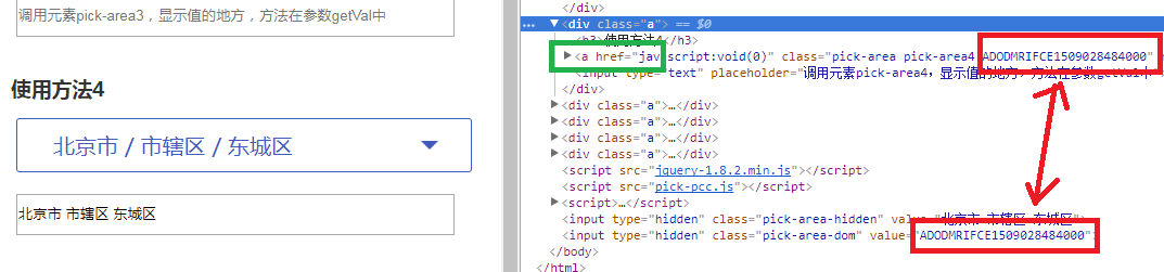 .pick-area-dom是插入页面中的隐藏域input[type==hidden]的类名,它的value值存放着getVal()回调函数触发一次之后,记录的调用插件的那个a元素,这个值(即$(".pick-area-dom").val())是一个类名,该类名唯一
