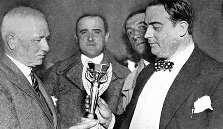 1930年恰逢乌拉圭独立100周年,第1届世界杯也决定在当时的足球第一强国乌拉圭举行。由于前往南美洲参赛费用高昂,不少欧洲国家都拒绝参加第1届的世界杯,只有4支欧洲球队参加。最终东道主乌拉圭在决赛中4-2战胜阿根廷捧得冠军奖杯。