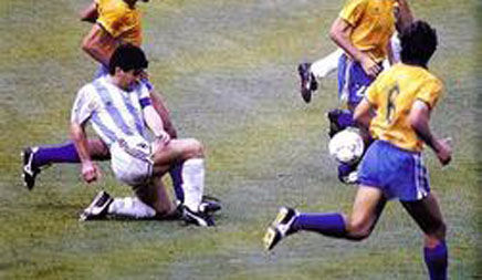 在阿根廷对巴西的比赛中,马拉多纳在中场带球,连续摆脱阿莱芒,邓加,罗查,并在多名巴西球员形成包夹之势时,倒地将球传给了无人防守的卡尼吉亚,后者轻松破门。