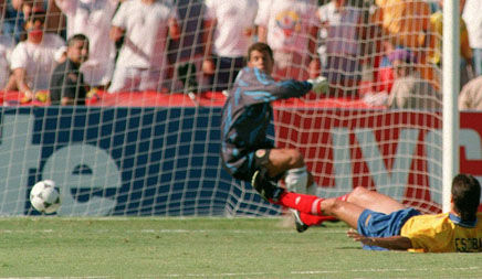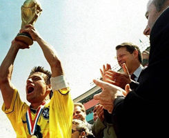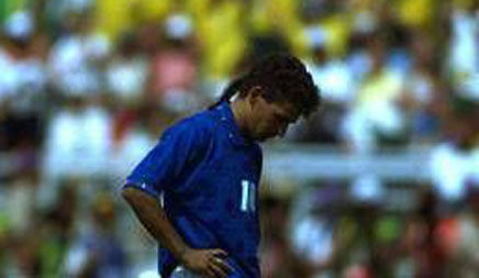 世界杯来到了被称作“足球荒漠”的美国,但主场球迷的热情让人们大吃一惊。球王马拉多纳因为兴奋剂事件竞赛,阿根廷早早失去了竞争力。最终进入决赛的是强大的巴西队和步履蹒跚的意大利队,最终两队在比赛中踢的非常保守不得不进入点球大战。最终巴西队点球3-2取胜,巴乔的忧郁背影成为那届世界杯的经典。罗马里奥成为最佳球员,斯托伊奇科夫和萨连科各进6球成为最佳射手。