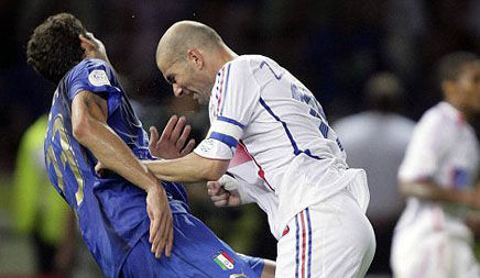 决赛加时赛中,马特拉齐对着齐达内喋喋不休,被对手言语激怒的齐达内一头顶正朝他走来的马特拉齐的胸口,后者应声倒地。主裁判在咨询了助理裁判的意见后,向齐达内出示了红牌。一代艺术大师就以这样的方式结束了自己的足球生涯。