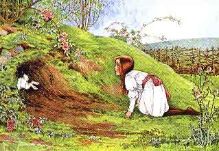 But when the Rabbit actually TOOK A WATCH OUT OF ITS WAISTCOAT- POCKET, and looked at it, and then hurried on, Alice started to her feet, for it flashed across her mind that she had never before see a rabbit with either a waistcoat-pocket, or a watch to take out of it, and burning with curiosity, she ran across the field after it, and fortunately was just in time to see it pop down a large rabbit-hole under the hedge.
