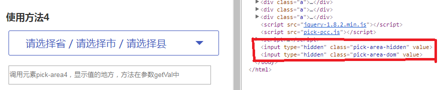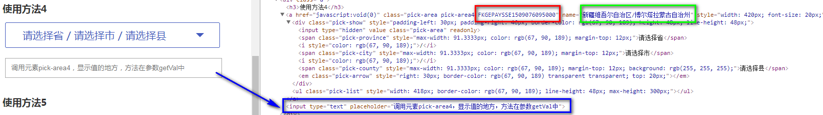 但是在<a href="javascript:void(0)" class="pick-area pick-area4">中已经多出了一个类名FKGEPAYSSE1509076095000,当我去触发一次getVal回调函数,这时<input type="hidden" class="pick-area-dom">中就存放了这个类名。