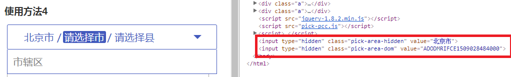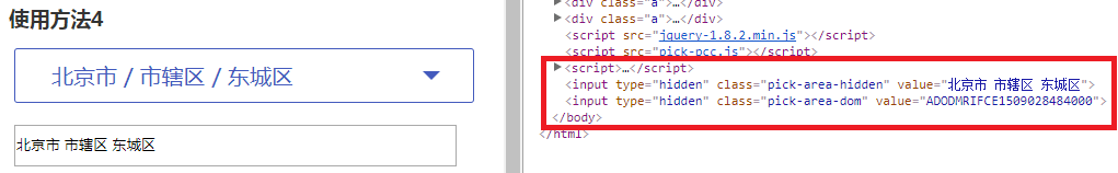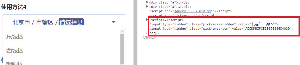 这个是页面中隐藏域.pick-area-hidden,即类名为pick-area-hidden的input[type==hidden]的值,存放着每次选中一个省、市或者县的时候,
