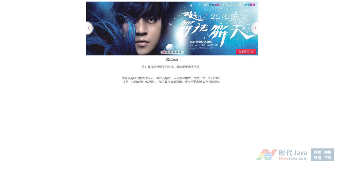 大麦网jquery焦点图代码,可左右翻页,自动滚动播放,大图尺寸:956x300。注意:按钮使用PNG图片,IE6不兼容背景透明,请使用更高版本的IE浏览器。