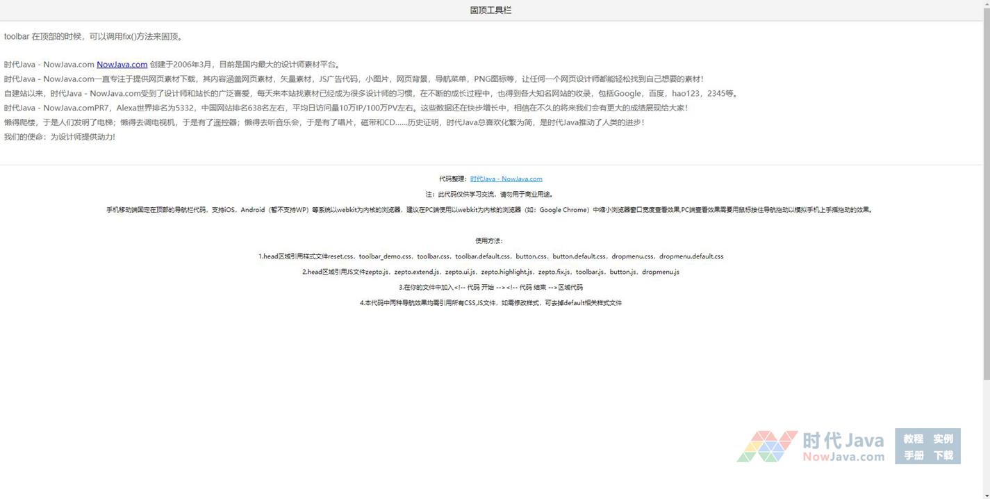 手机移动端固定在顶部的导航栏代码,支持iOS,Android(暂不支持WP)等系统以webkit为内核的浏览器,建议在PC端使用以webkit为内核的浏览器(如:Google Chrome)中缩小浏览器窗口宽度查看效果,PC端查看效果需要用鼠标按住导航拖动以模拟手机上手指拖动的效果。