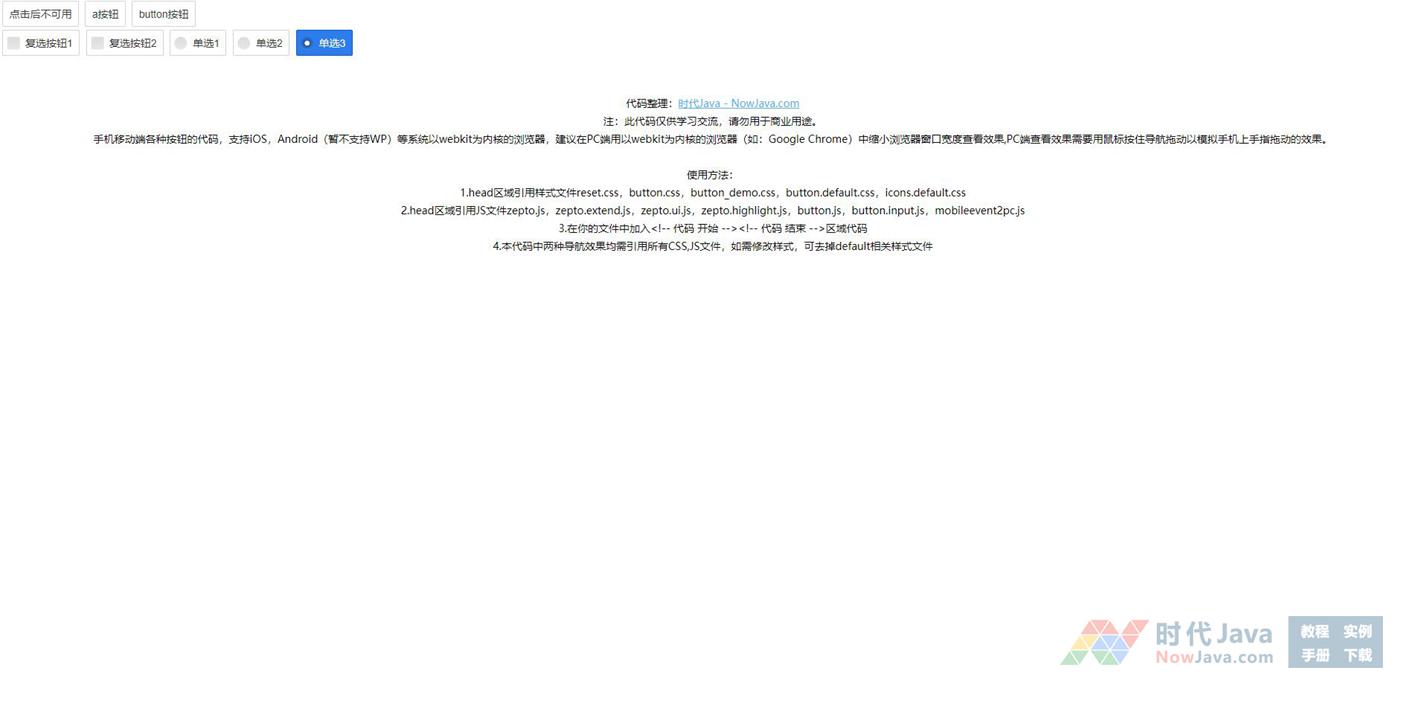 手机移动端各种按钮的代码,支持iOS,Android(暂不支持WP)等系统以webkit为内核的浏览器,建议在PC端用以webkit为内核的浏览器(如:Google Chrome)中缩小浏览器窗口宽度查看效果,PC端查看效果需要用鼠标按住导航拖动以模拟手机上手指拖动的效果。