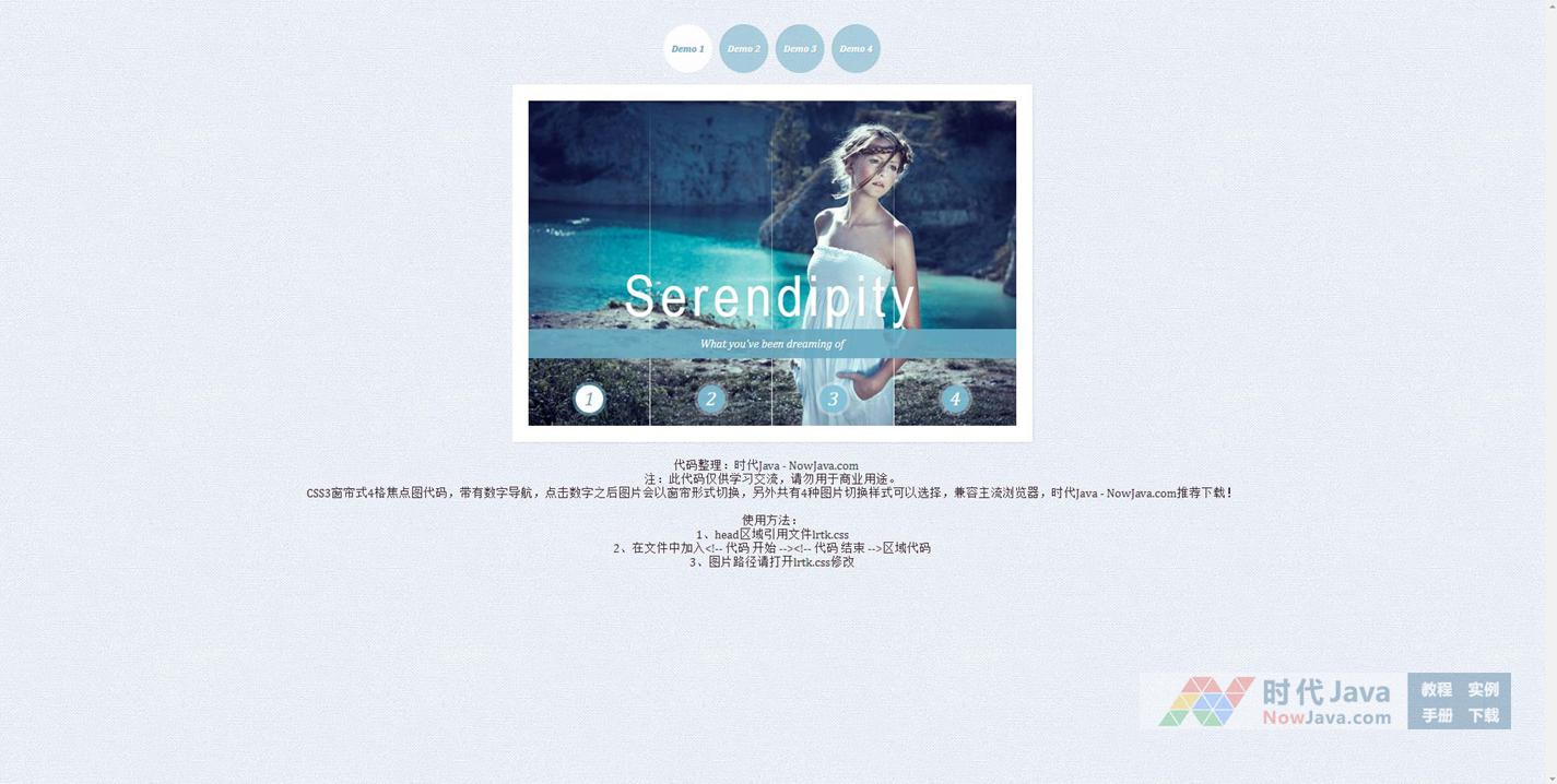 CSS3窗帘式4格焦点图代码,带有数字导航,点击数字之后图片会以窗帘形式切换,另外共有4种图片切换样式可以选择,兼容主流浏览器,推荐下载!