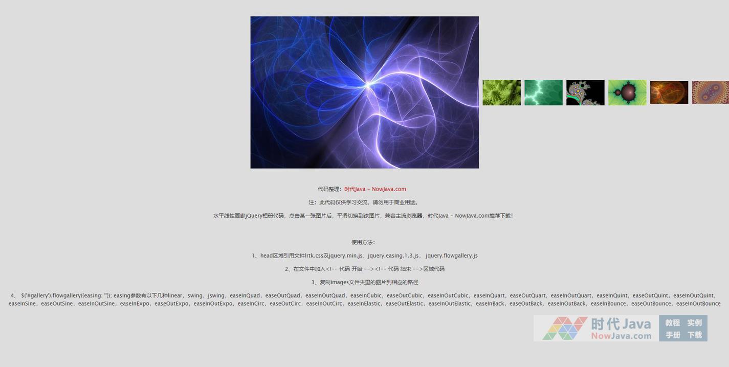 4、 $('#gallery').flowgallery({easing: ''}); easing参数有以下几种linear,swing,jswing,easeInQuad,easeOutQuad,easeInOutQuad,easeInCubic,easeOutCubic,easeInOutCubic,easeInQuart,easeOutQuart,easeInOutQuart,easeInQuint,easeOutQuint,easeInOutQuint,easeInSine,easeOutSine,easeInOutSine,easeInExpo,easeOutExpo,easeInOutExpo,easeInCirc,easeOutCirc,easeInOutCirc,easeInElastic,easeOutElastic,easeInOutElastic,easeInBack,easeOutBack,easeInOutBack,easeInBounce,easeOutBounce,easeInOutBounce