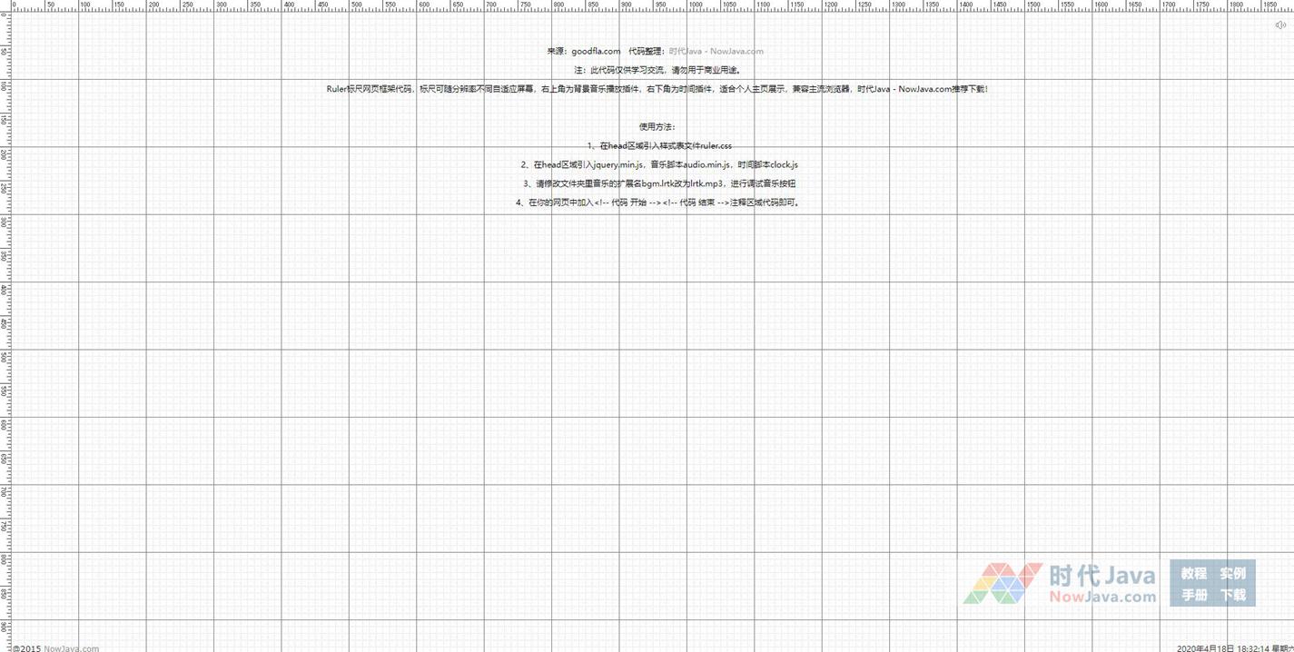 Ruler标尺网页框架代码,标尺可随分辨率不同自适应屏幕,右上角为背景音乐播放插件,右下角为时间插件,适合个人主页展示,兼容主流浏览器,推荐下载!