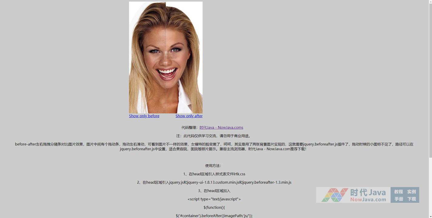 before-after左右拖拽分隔条对比图片效果,图片中间有个拖动条,拖动左右滑动,可看到图片不一样的效果,女模特的脸变嫩了,呵呵,其实是用了两张背景图片实现的,这就需要jquery.beforeafter.js插件了,拖动时候的小图标不见了,路径可以在jquery.beforeafter.js中设置,适合美容院,医院等照片展示。兼容主流浏览器,推荐下载!