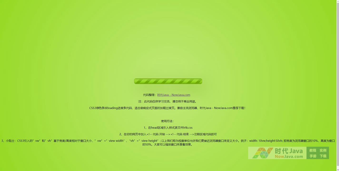 CSS3绿色条纹loading进度条代码,适合做响应式页面的加载过度页。兼容主流浏览器,推荐下载!
