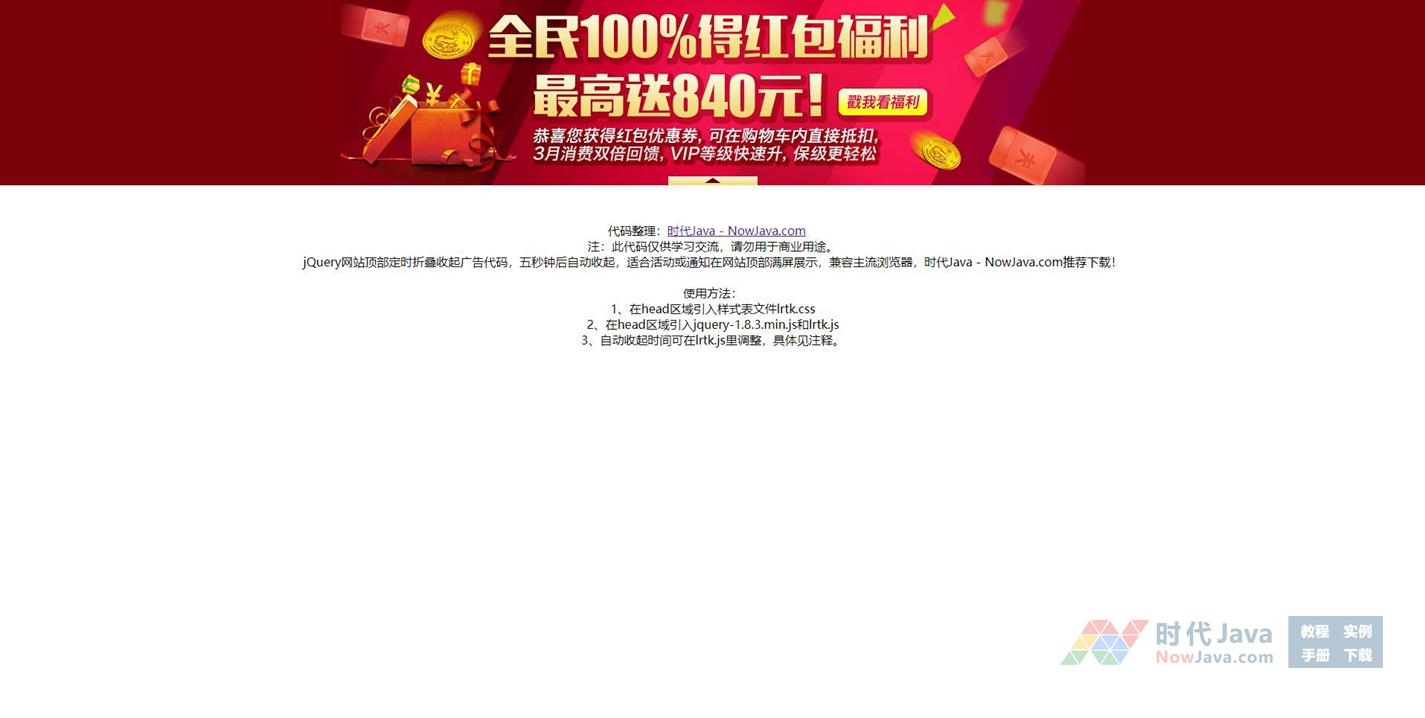 jQuery网站顶部定时折叠收起广告代码,五秒钟后自动收起,适合活动或通知在网站顶部满屏展示,兼容主流浏览器,推荐下载!