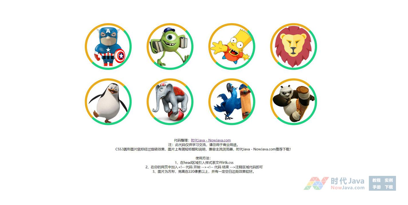CSS3圆形图片鼠标经过旋转效果,图片上有简短标题和说明,兼容主流浏览器,推荐下载!