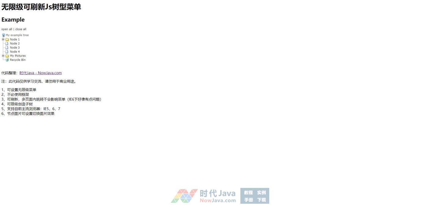 1、可设置无限级菜单2、不必使用框架3、可刷新,多页面内跳转不会影响菜单(IE6下好像有点问题)4、可限级创造子树5、支持目前主流浏览器:IE5,6,76、节点图片可设置切换图片效果