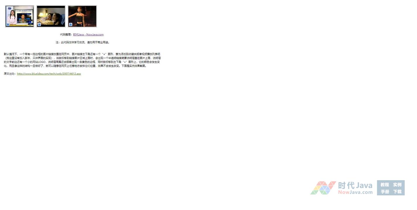 默认情况下,一个带有一定边框的图片链接放置在网页中,图片链接左下角还有一个“+”图形,意为添加到收藏夹或者视频播放列表吧(我这里没有加入脚本,只讲界面的实现),当鼠标移到链接图片区域上面时,会出现一个半透明链接简要说明层盖在图片上面,说明层的文字前边还有一个小的网站LOGO,说明层周围还会跟着出现一条黄色的边框,同时鼠标移到左下角“+”图形上,它的颜色会发生变化,而且像这样的结构一旦做好了,就可以随意在网页上任意地方安排它们位置,效果不会发生改变。下面是实例效果截图。