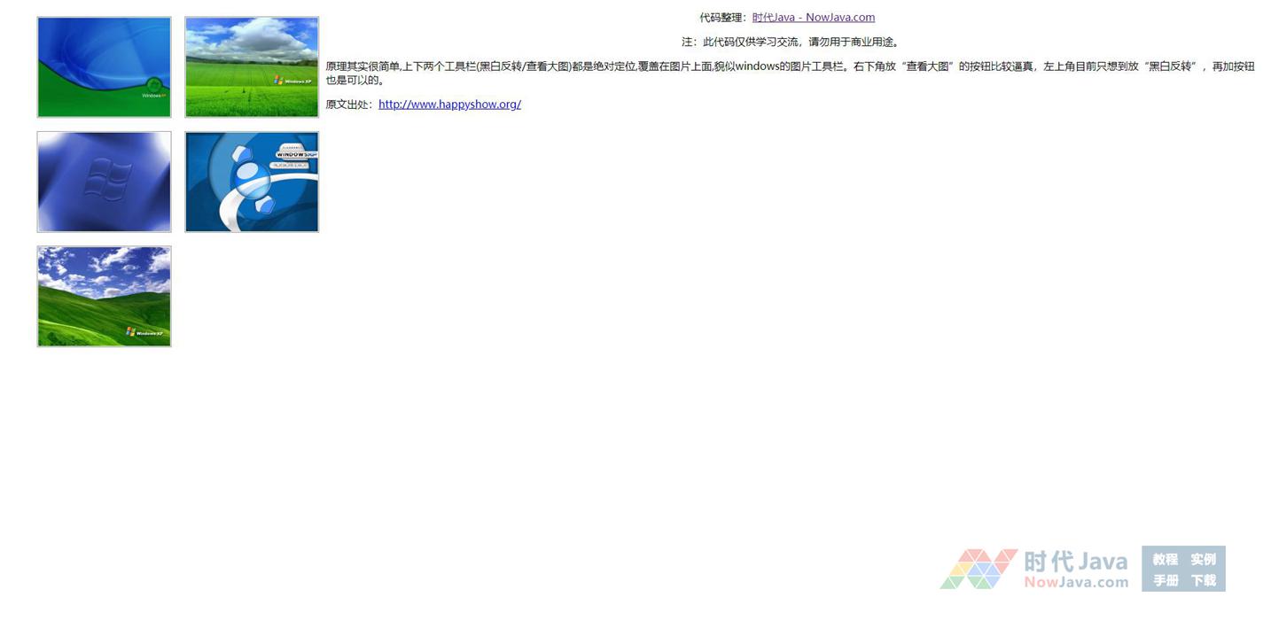 原理其实很简单,上下两个工具栏(黑白反转/查看大图)都是绝对定位,覆盖在图片上面,貌似windows的图片工具栏。右下角放“查看大图”的按钮比较逼真,左上角目前只想到放“黑白反转”,再加按钮也是可以的。