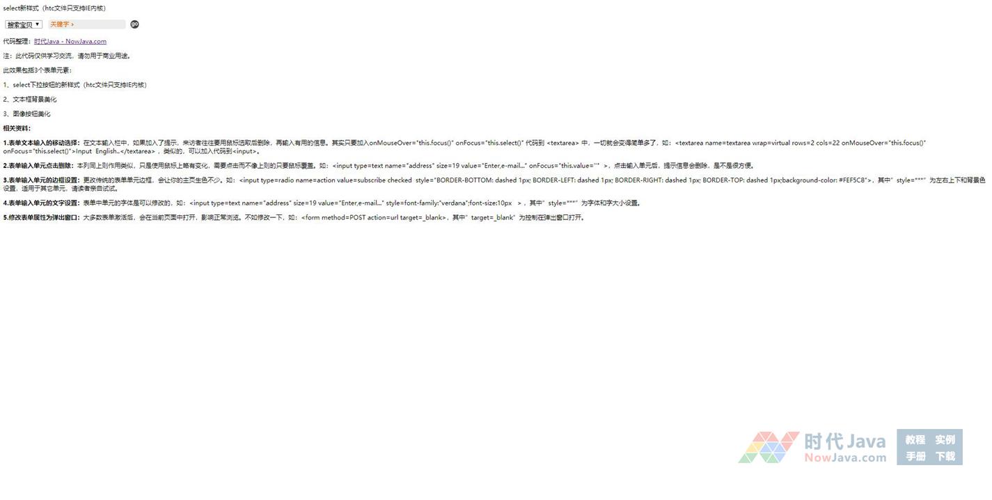 1.表单文本输入的移动选择:在文本输入栏中,如果加入了提示,来访者往往要用鼠标选取后删除,再输入有用的信息。其实只要加入onMouseOver="this.focus()" onFocus="this.select()" 代码到 <textarea> 中,一切就会变得简单多了,如:<textarea name=textarea wrap=virtual rows=2 cols=22 onMouseOver="this.focus()" onFocus="this.select()">Input English..</textarea> ,类似的,可以加入代码到<input>。