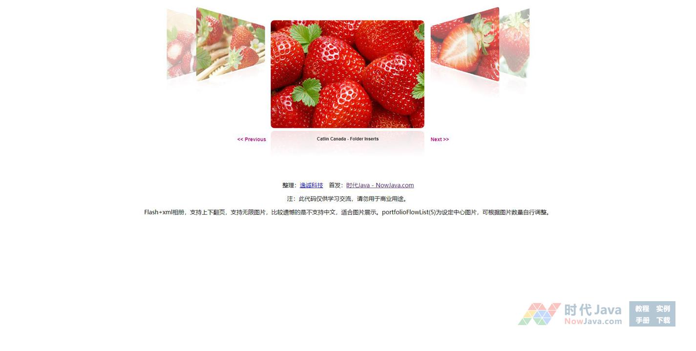 Flash+xml相册,支持上下翻页,支持无限图片,比较遗憾的是不支持中文,适合图片展示。portfolioFlowList(5)为设定中心图片,可根据图片数量自行调整。