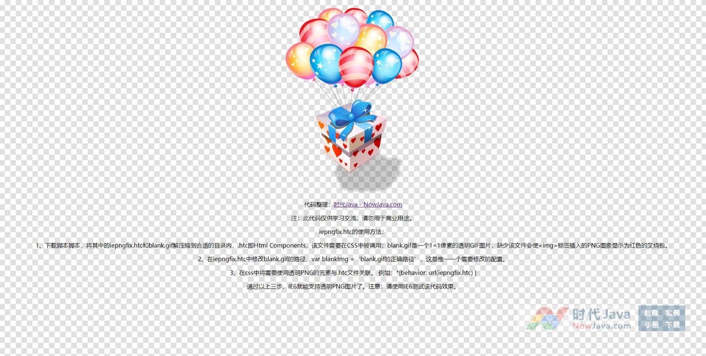 1、下载脚本脚本,将其中的iepngfix.htc和blank.gif解压缩到合适的目录内,.htc即Html Components,该文件需要在CSS中被调用;blank.gif是一个1×1像素的透明GIF图片,缺少该文件会使<img>标签插入的PNG图象显示为红色的叉烧包。