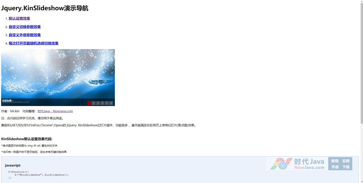 兼容IE6/IE7/IE8/IE9,FireFox,Chrome*,Opera的 jQuery. KinSlideshow幻灯片插件,功能很多 ,基本能满足你在网页上使用幻灯片(焦点图)效果。