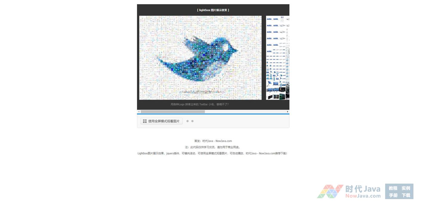 Lightbox图片展示效果,jquery插件,可横向滚动,可使用全屏模式观看图片,可自动播放,推荐下载!