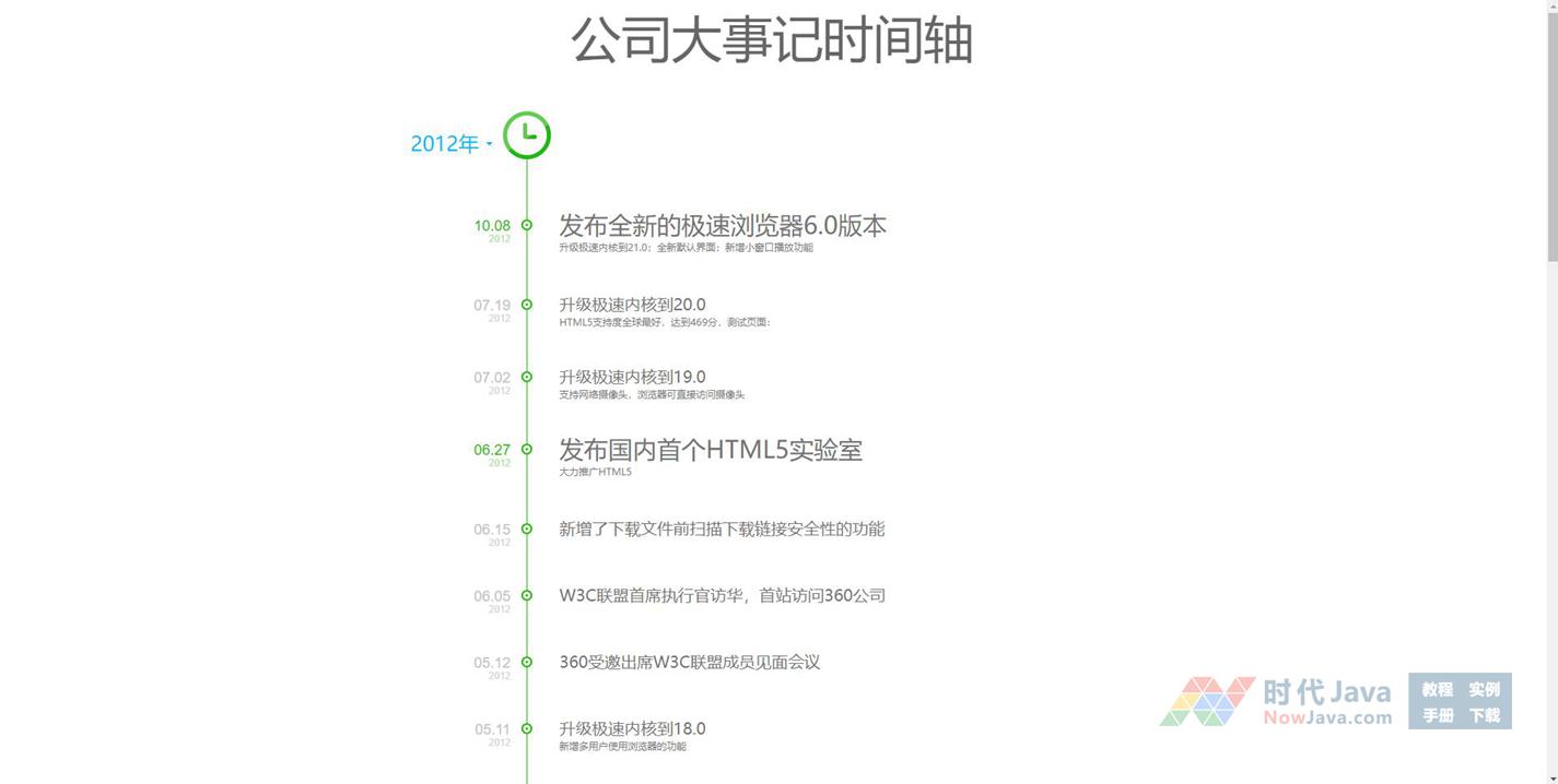 公司大事记时间轴(jQuery版),打开后会自动展开,样式简洁,表现清晰,适合公司大事记或历程的表现,仅供学习参考。