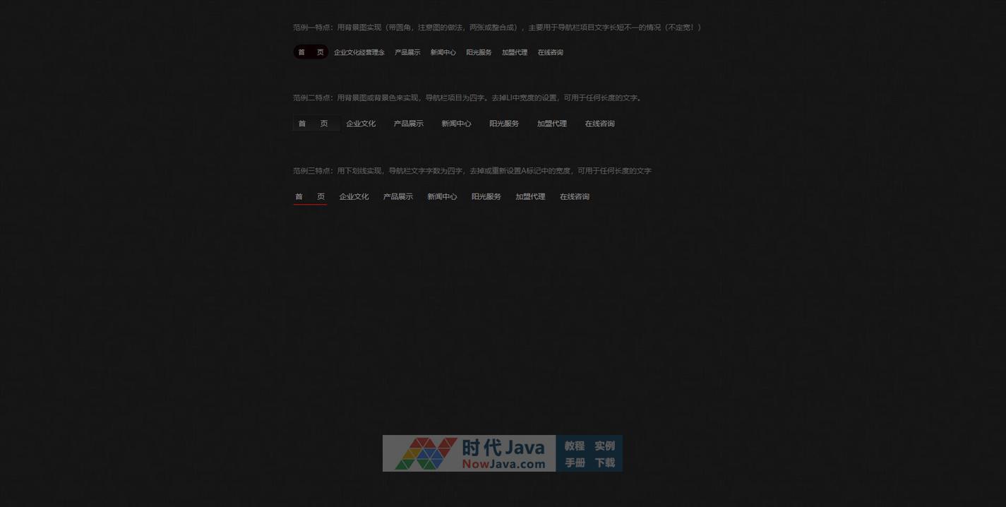 范例三特点:用下划线实现,导航栏文字字数为四字,去掉或重新设置A标记中的宽度,可用于任何长度的文字