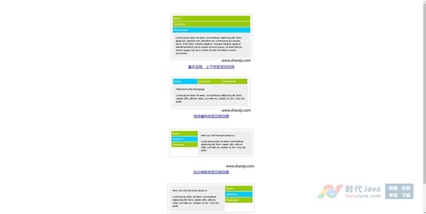 本范例包含了各种常用的Tab切换效果,每种切换都带有过度动画效果,有横向标签,纵向标签,居左标签,居右标签,非常强悍,值得推荐,感兴趣的朋友可以下载学习