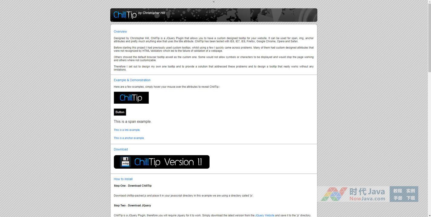 一个完全可以自定义提示信息效果的jQuery插件chilltip,通过这个插件可以很容易的定义指定对象的提示信息,鼠标滑过指定的对象,自动显示一个内容风格的小提示框,鼠标离开,提示框自动消失。经测试效果相当不错,感兴趣的朋友可以下载学习哈
