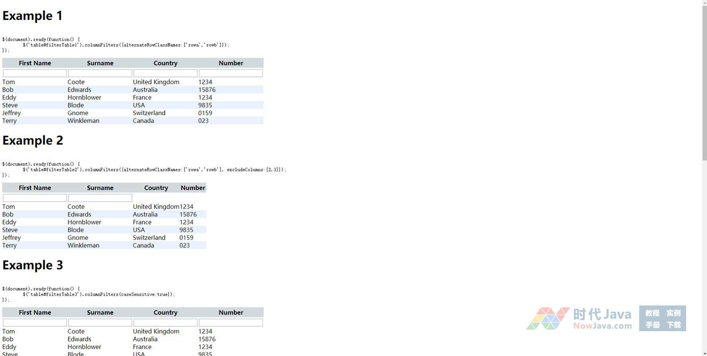 jQuery实现的表格列数据过滤功能,可以先定义表格数据,在文本框数据文本,表格数据会自动根据数据模糊匹配对数据进行过滤显示。