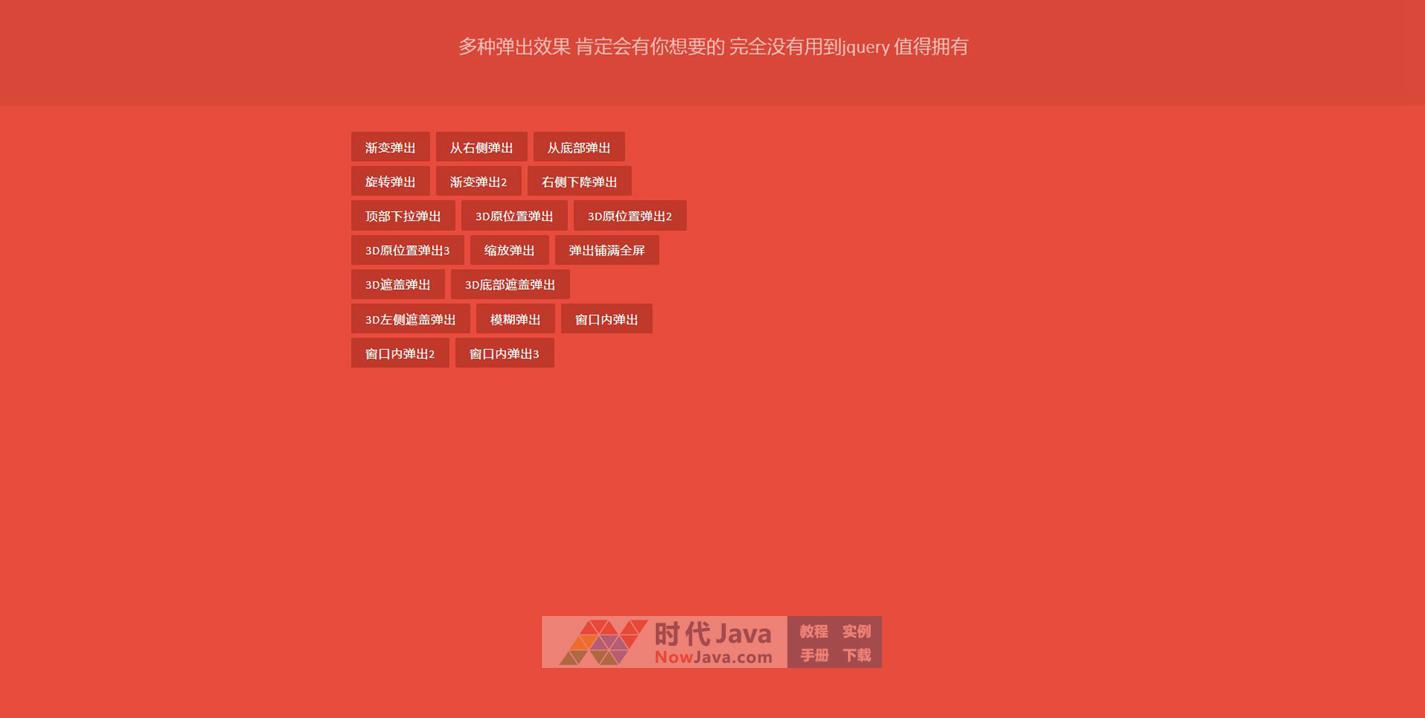 CSS3+JS实现的不同交互弹出框带关闭按钮动态特效源码,是一段实现了多款从不同角度弹出的拥有不同风格的无刷新效果的遮罩提示框带关闭按钮效果代码,本段代码适用于所有网页使用,有需要的朋友们可以选择其中一款或多款交互弹出框效果修改使用。本段代码兼容目前最新的各类主流浏览器,是一款非常优秀的特效源码。