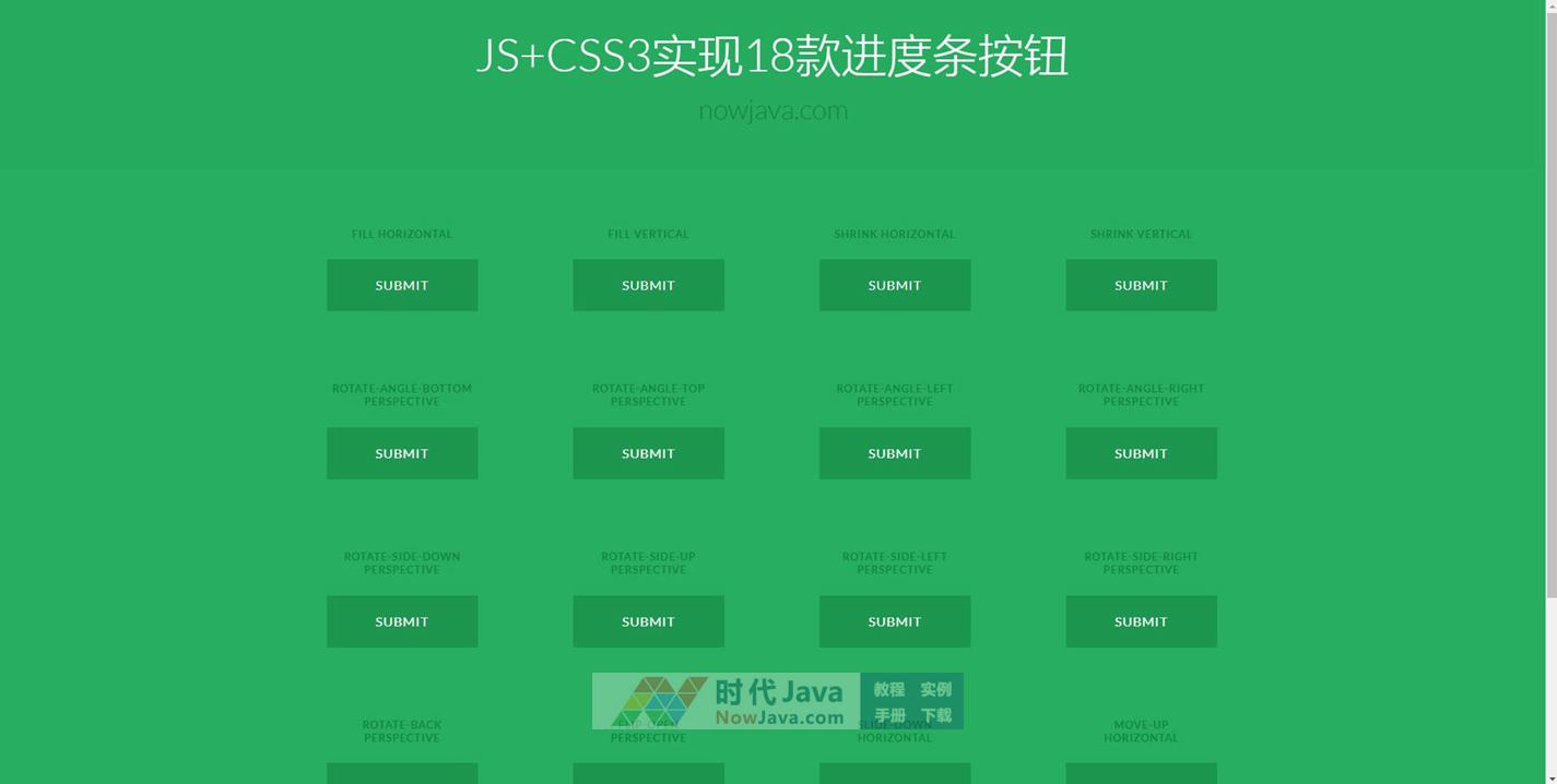 我们在网页上提交数据的时候经常会看到进度条,不过大部分进度条都是在网页其他地方显示,比如弹出一个窗口。这款CSS3实现的进度条是显示在按钮上的,可以更直观的体现出用户提交的进度情况,该CSS3进度条按钮样式非常漂亮,在支持3D的浏览器上还能有3D立体的效果,而且进度条展现形式很多,一共18种样式。建议用户使用支持css3与HTML5的火狐或谷歌等浏览器预览本实例源码。