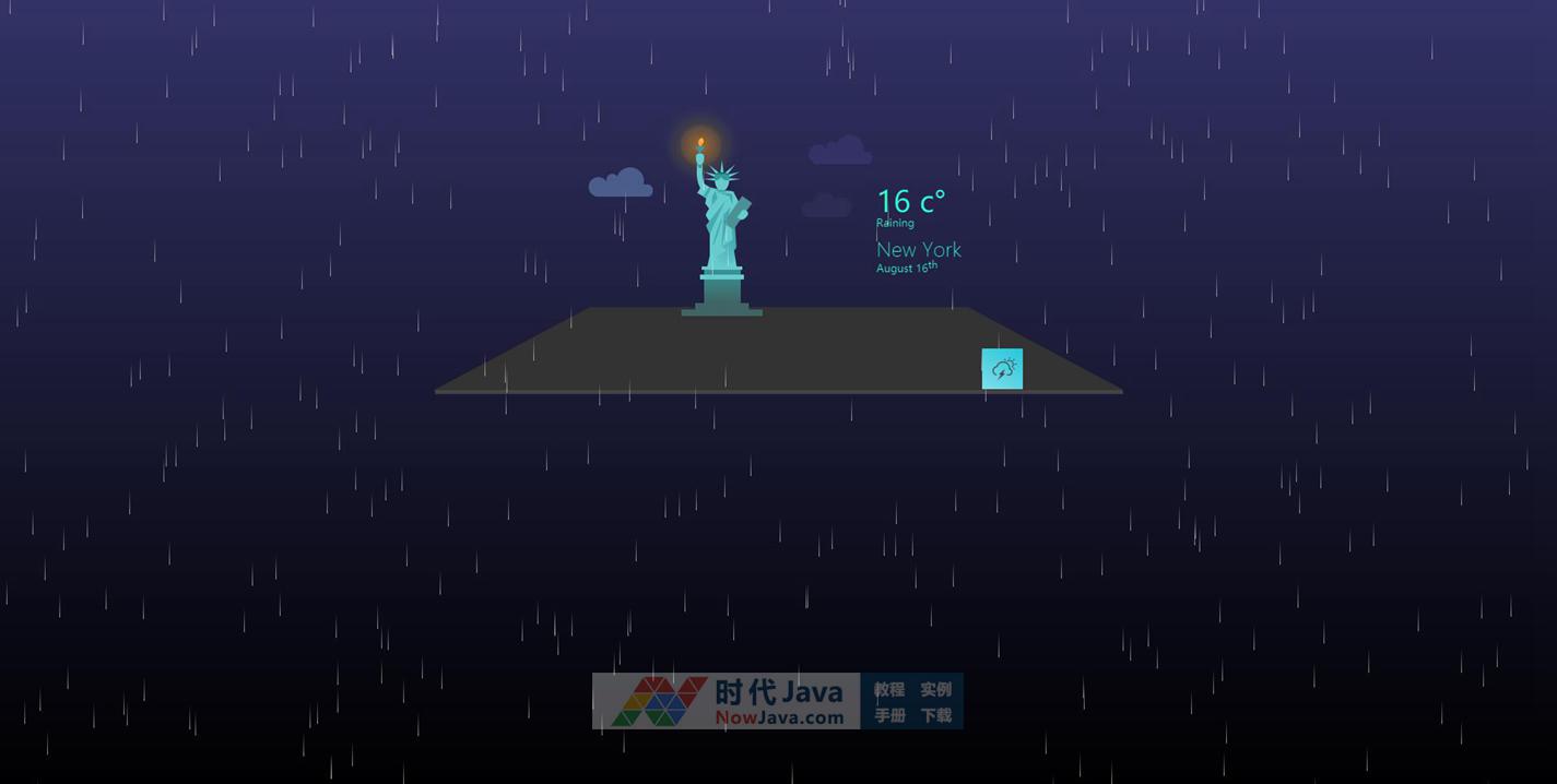 这是一款基于纯CSS3实现带3D卡片翻转效果的天气预报动画特效源码。画面上由纯css3绘制的卡片界面上浮现着一个自由女神像,右侧带有相应的天气信息。同时背景图上还伴有降雨和闪电的动画效果。点击右下方的按钮还可使卡片翻页,呈现出卡片状的信息展示。该特效采用纯css3实现,没有引入任何外部图形或js元素,建议使用支持HTML5与css3效果较好的火狐(Firefox)或谷歌(Chrome)等浏览器预览本源码。