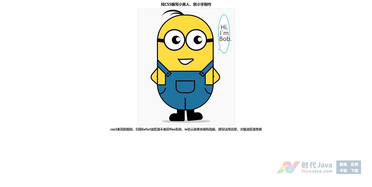 这是一款采用纯css3绘制的小黄人头像动画特效源码,画面中的小黄人手脚、眼睛、嘴以及头发都可呈现运动效果。该特效完全采用纯css3技术实现,没有引入外部图片资源。建议使用对css3及html5支持较好的火狐或谷歌等浏览器预览本源码。
