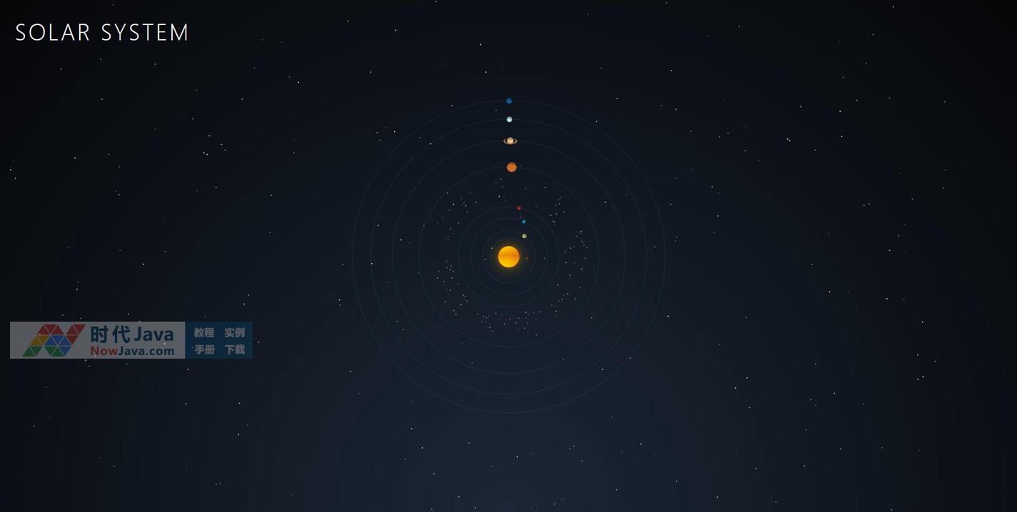 这是一款基于纯CSS3实现逼真的太阳系天体运行动画效果源码。黑色夜幕的宇宙星空背景上呈现出等比例的太阳系九大行星按照各自轨道运行的动画场景效果,其中的地球还伴随着月亮的旋转绕行,而行星之间还有围绕太阳运行的小行星带。整体效果逼真自然。该动画特效完全采用纯css3绘制实现,建议使用支持HTML5与css3效果较好的火狐(Firefox)或谷歌(Chrome)等浏览器预览本源码。