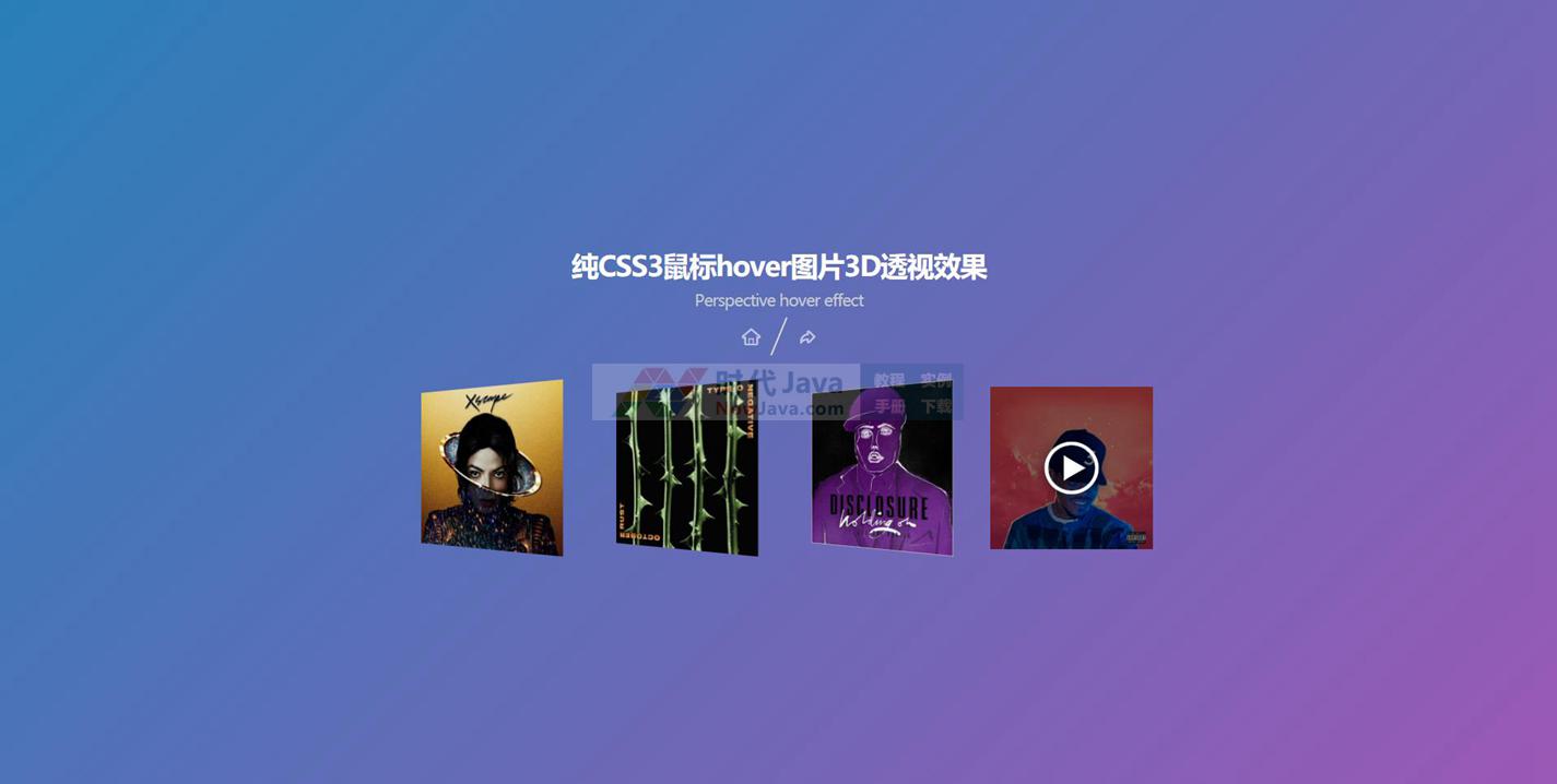 这是一款使用纯CSS3制作的鼠标hover图片3D透视动画效果。该透视动画使用transform来完成炫酷的hover效果,简单炫酷,使用方便!本代码适用浏览器:搜狗、360、FireFox(建议)、Chrome、Safari、Opera、傲游、世界之窗,不支持IE8及以下浏览器,首选火狐浏览器。是一款不错的的特效插件,需要的朋友可以下载!希望大家喜欢!