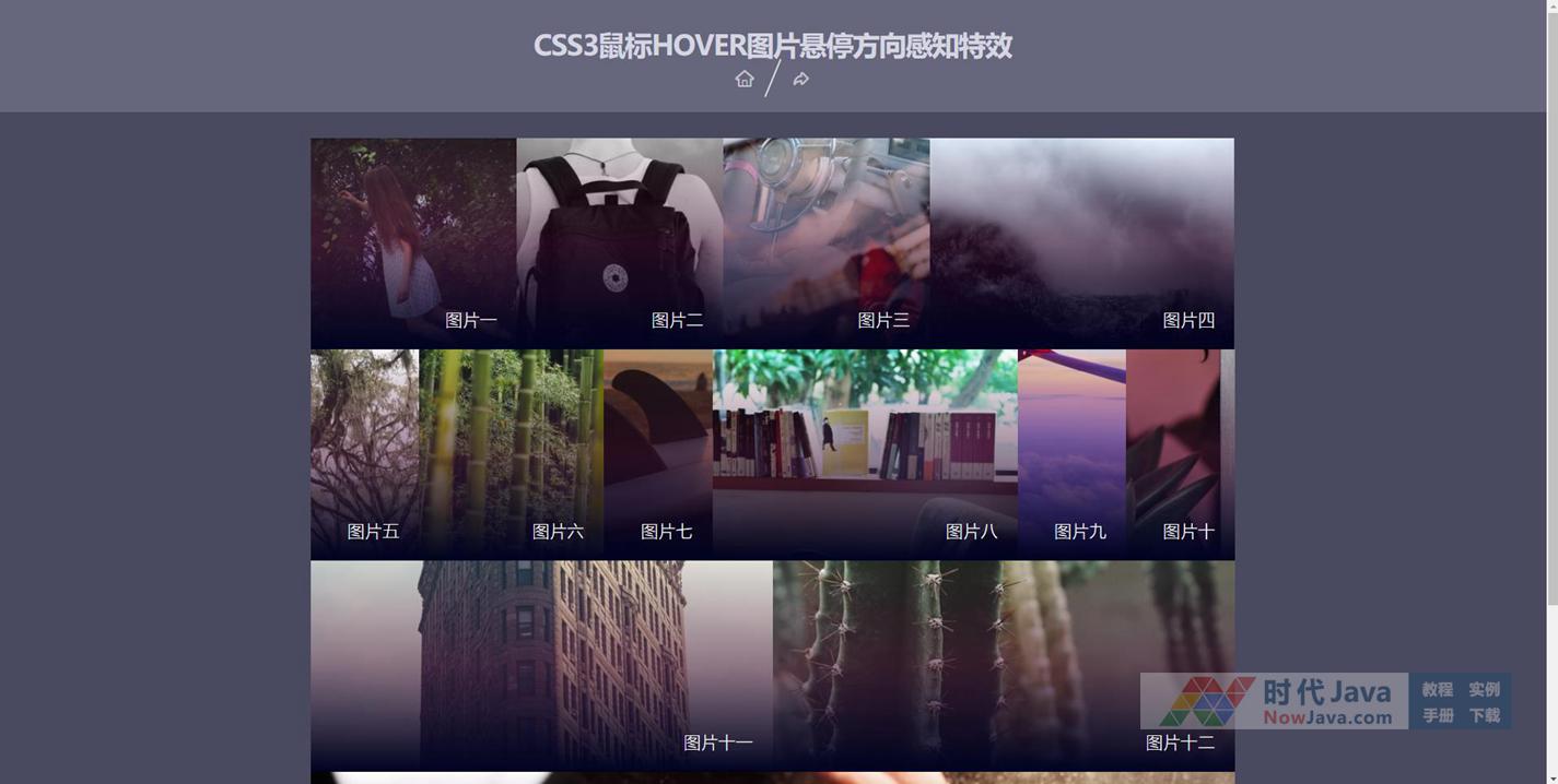 这是一款使用CSS3制作的鼠标HOVER图片悬停方向感知特效。该特效能够在鼠标hover图片时,在图片上产生一个遮罩层,并且在移动鼠标时,遮罩层会根据鼠标的方向进行移动。本段代码兼容目前最新的各类主流浏览器,适用浏览器:搜狗、360、FireFox(建议)、Chrome、Safari、Opera、傲游、世界之窗,不支持IE8及以下浏览器,首选火狐浏览器。是一款不错的的特效插件,需要的朋友可以下载!希望大家喜欢!