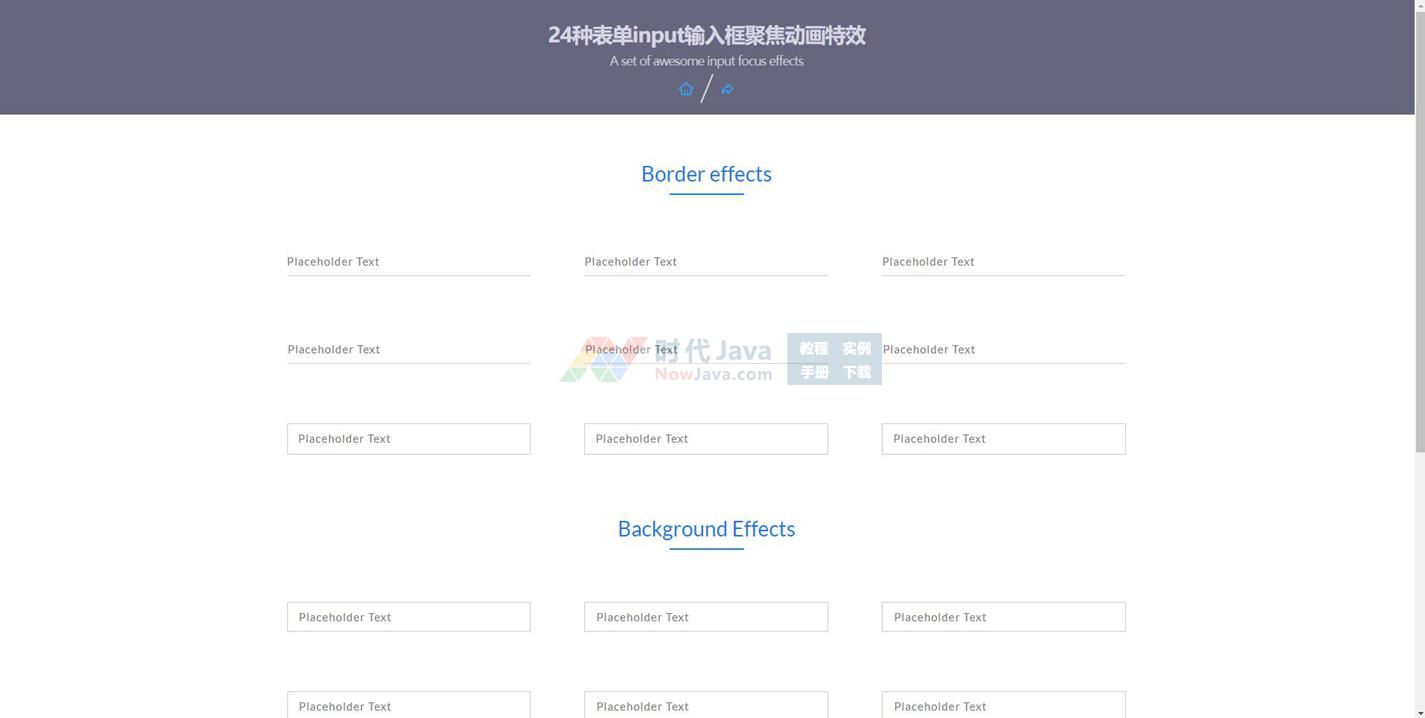 本特效是一组效果超酷的表单input输入框聚焦CSS3动画特效效果的代码。这组特效共24种不同的聚焦动画效果,分为3个类别,分别是边框动画特效,背景动画特效和浮动标签动画特效。本代码适用浏览器:搜狗、360、FireFox、Chrome、Safari、Opera、傲游、世界之窗,不支持IE8及以下浏览器。有兴趣的朋友们可以来下载试试吧。本段代码兼容目前最新的各类主流浏览器,是一款非常优秀的特效源码。希望大家可以喜欢!
