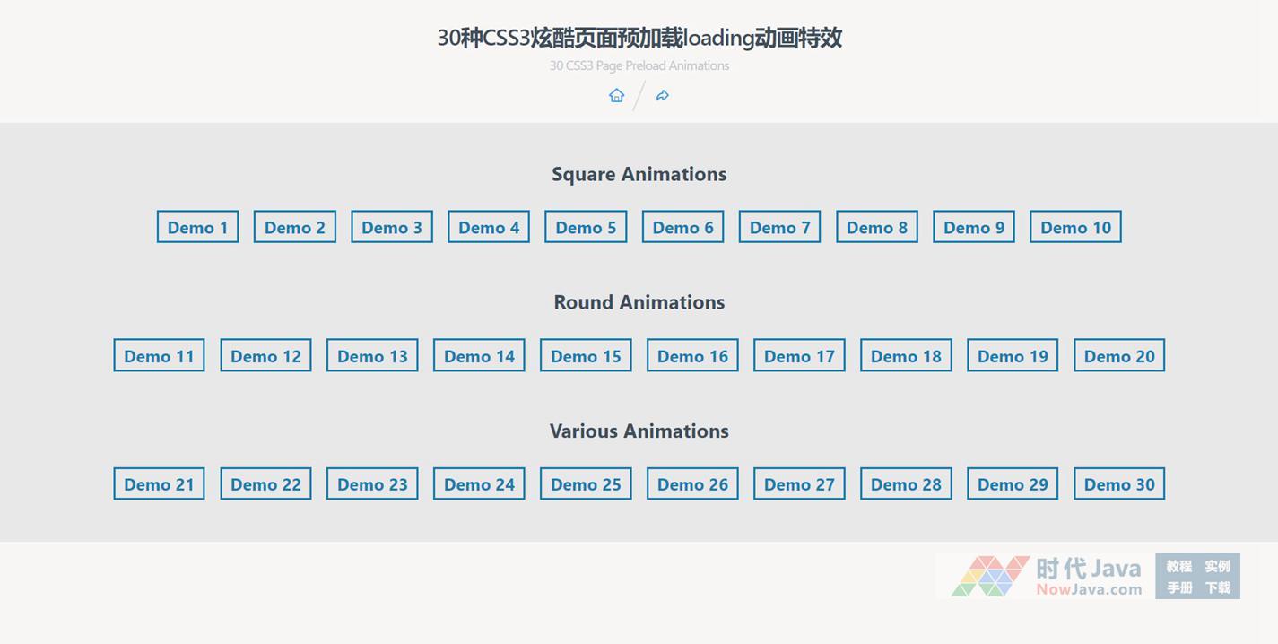 这30种loading动画分为3组:方形加载动画特效、圆形加载动画特效和长条形加载动画特效。每一种效果都有一个单独的页面,你可以对应查看每种效果的CSS代码。