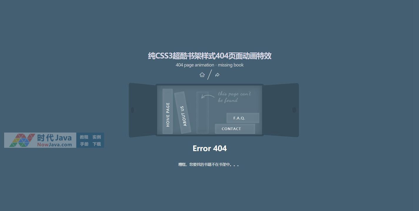 本特效是一款使用CSS3帧动画来制作的炫酷404页面动画效果的代码。该404页面以书架为主题,当某个页面不存在时,以书架中找不到这本书来表示,非常有创意。本代码适用浏览器:搜狗、360、FireFox、Chrome、Safari、Opera、傲游、世界之窗,不支持IE8及以下浏览器。有兴趣的朋友们可以来下载试试吧。本段代码兼容目前最新的各类主流浏览器,是一款非常优秀的特效源码。希望大家可以喜欢!