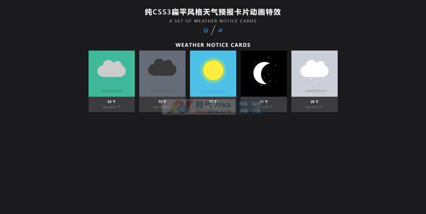 本特效源码是一款非常有意思的纯CSS3扁平风格天气预报卡片动画特效的代码。该天气预报特效将各种天气制作为卡片形式,包括下雨,闪电,白天,夜间和下雪。卡片使用扁平化风格,并使用CSS3帧动画来制作各种动画效果。本代码适用浏览器:搜狗、360、FireFox、Chrome、Safari、Opera、傲游、世界之窗,不支持IE8及以下浏览器。有兴趣的朋友们可以来下载试试吧。本段代码兼容目前最新的各类主流浏览器,是一款非常优秀的特效源码。希望大家可以喜欢!