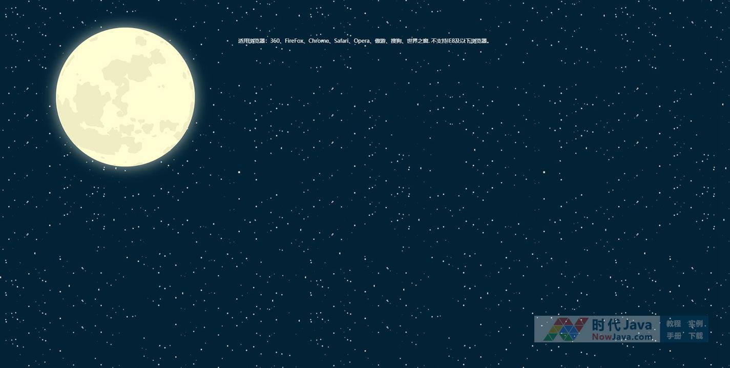 纯CSS3实现的夜晚天空月亮动画特效源码是一段实现了非常逼真的夜晚天空月亮星星的动画效果背景代码,本段代码适应于所有网页使用,有兴趣的朋友们可以前来下载使用。本段代码兼容目前最新的各类主流浏览器,是一款非常优秀的特效源码。