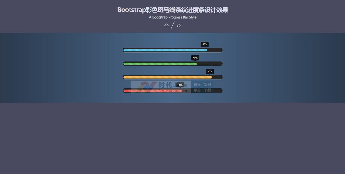 本特效是一款基于Bootstrap制作的超酷彩色斑马线条纹进度条设计效果的代码。该进度条动画特效通过简单的CSS3 animation动画来完成,整个进度条设计时尚大方。本段代码兼容目前最新的各类主流浏览器,是一款非常优秀的特效源码。本代码适用浏览器:搜狗、360、FireFox、Chrome、Safari、Opera、傲游、世界之窗,不支持IE8及以下浏览器。有兴趣的朋友们可以来下载试试效果!