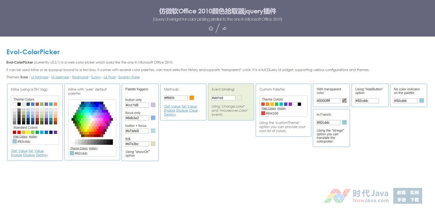 evol.colorpicker是一个基于jqueryUI可实现仿微软Office 2010颜色拾取器的jquery插件。该颜色拾取器插件提供多种颜色调色板,支持透明颜色,可通过jqueryui来更换主题,炫酷实用,欢迎下载!本代码适用浏览器:搜狗、360、FireFox(建议)、Chrome、Safari、Opera、傲游、世界之窗,不支持IE8及以下浏览器,首选火狐浏览器。是一款不错的的特效插件,需要的朋友可以下载!希望大家喜欢!
