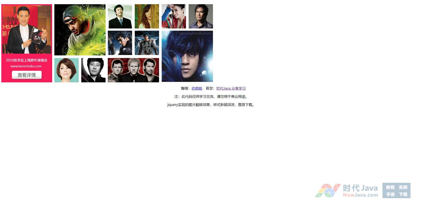 jquery实现的图片翻转效果,样式新颖活泼,推荐下载。鼠标放上去,显示介绍文字信息。