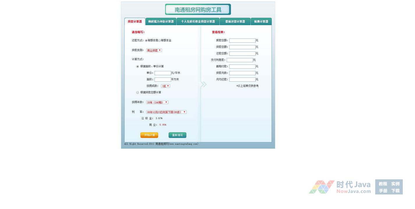 基于JavaScript的购房计算工具网页版,比如货款计算器、购房能力评估计算器,计算包括现金、存款、有价证券和可以筹措到的资金总和、个人住房公积金贷款计算器、提前还款计算器、税费计算器等,每一个计算工具都有详细的公式和可操作性,而且页面设计精美、专业,也是研究Js算法的好范例。