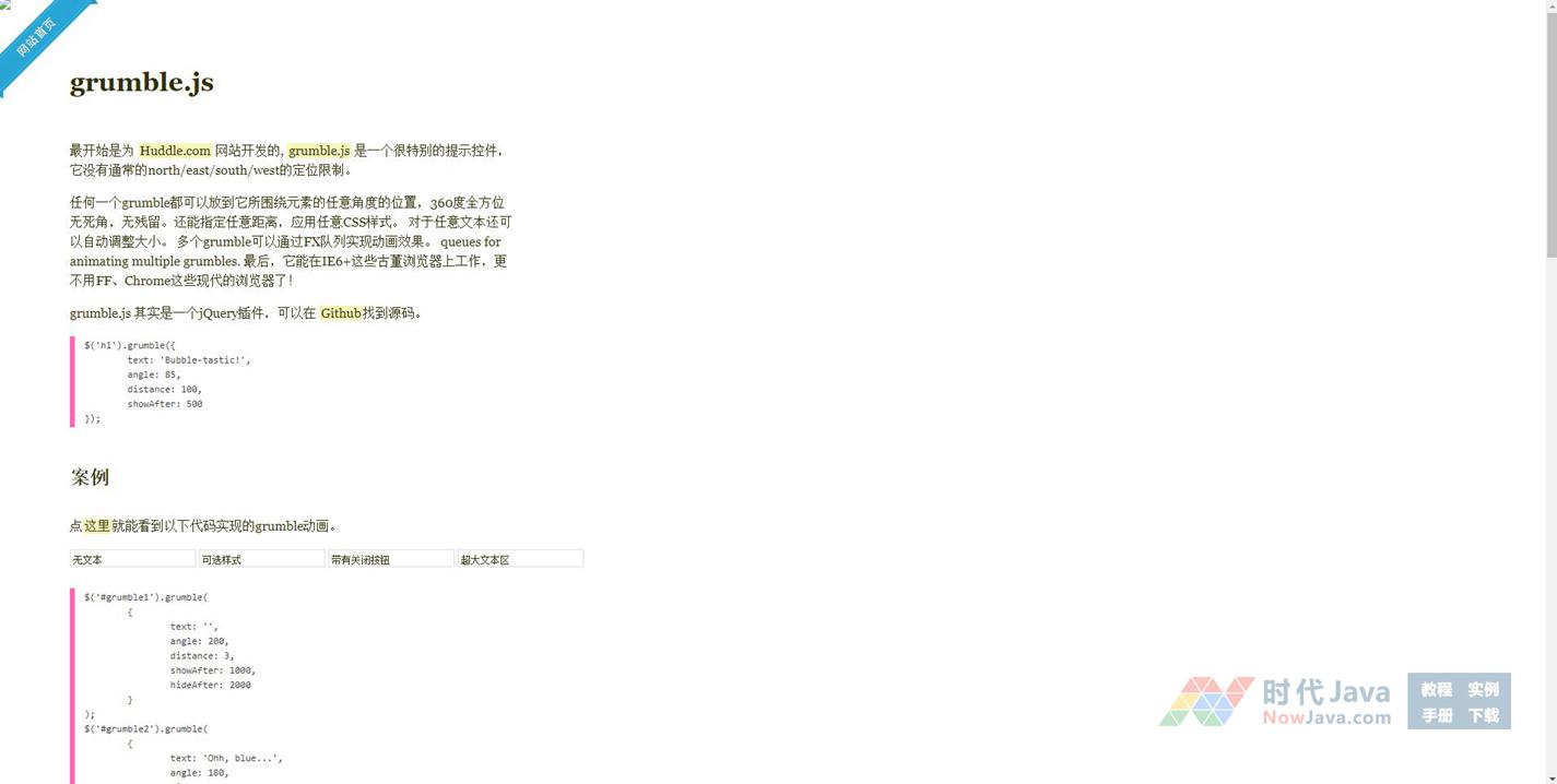 任何一个grumble都可以放到它所围绕元素的任意角度的位置,360度全方位无死角,无残留。还能指定任意距离,应用任意CSS样式。 对于任意文本还可以自动调整大小。 多个grumble可以通过FX队列实现动画效果。 queues for animating multiple grumbles. 最后,它能在IE6+这些古董浏览器上工作,更不用FF、Chrome这些现代的浏览器了!
