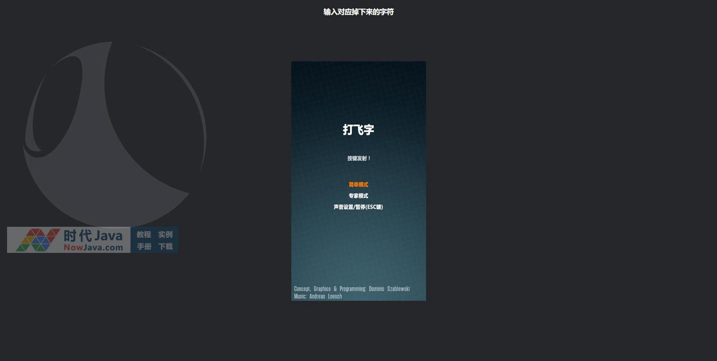 这是一款基于html5 canvas实现的飞机打字练习功能游戏源码。进入游戏开始页面,玩家可自主修改“简单模式”与“专家模式”等不同游戏难度,还可调整音量。进入游戏后玩家根据下落的单词打字,则出现飞机发射炮弹击中单词的效果。游戏结束后可统计出相应的分数、打字速度等数据。建议使用支持HTML5与css3效果较好的火狐(Firefox)或谷歌(Chrome)等浏览器预览本源码。