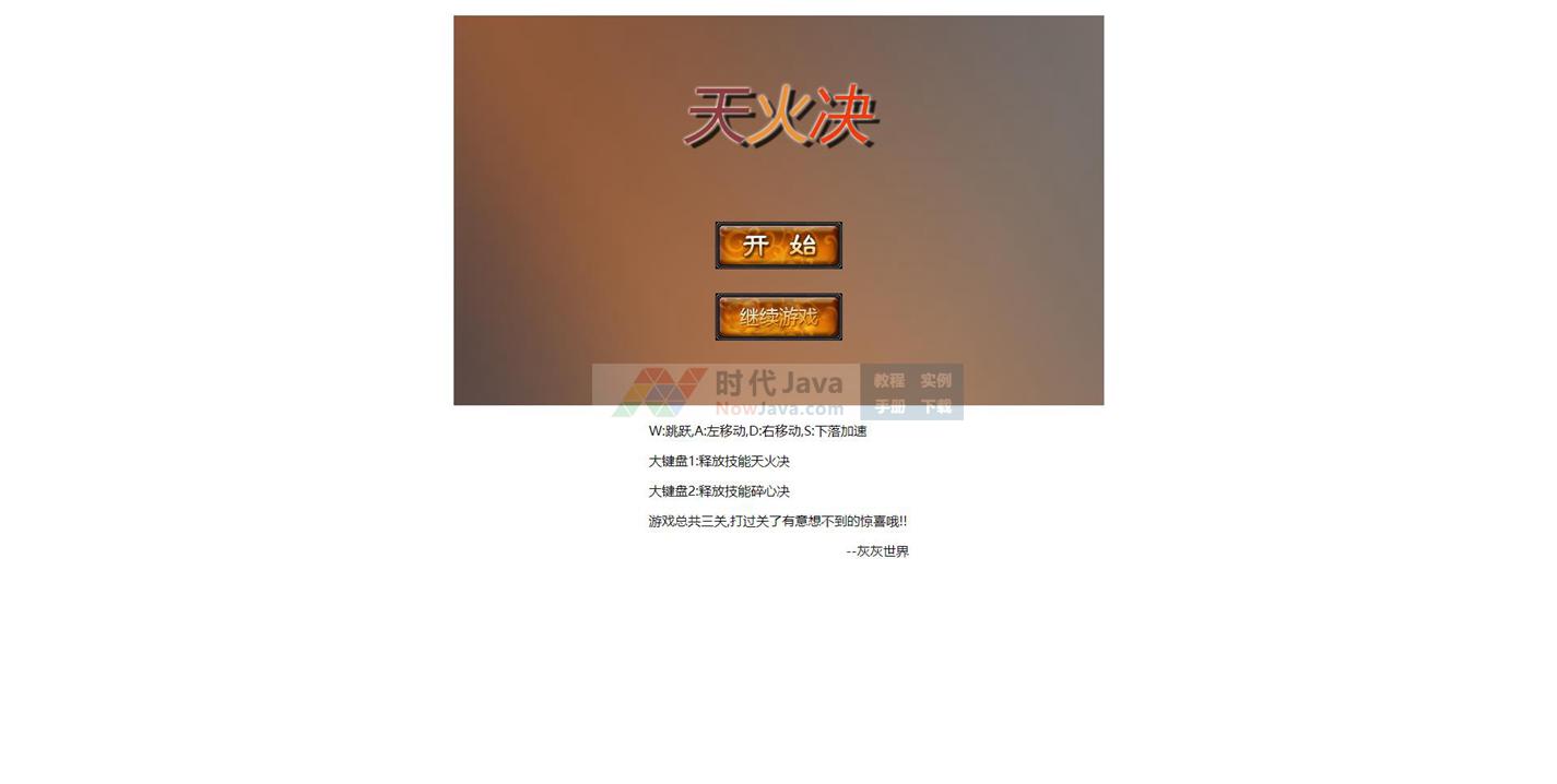 这是一款基于html5 canvas实现的天火决冒险类闯关游戏源码。玩家点击开始进入游戏,通过键盘WASD键控制游戏中的人物移动与跳跃,大键盘数字1,2键可释放大招。游戏共有3关。是一款比较经典的HTML5冒险类闯关游戏。建议使用支持HTML5与css3效果较好的火狐(Firefox)或谷歌(Chrome)等浏览器预览本源码。